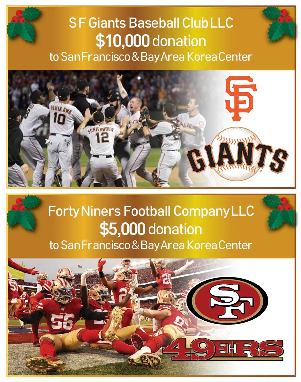 – San Francisco & Bay Area 한인회, 샌프란시스코 자이언츠로부터 1만 달러 후원금 지원 및 미프로미식축구팀49ers로부터도 5천 달러 후원금 전달받아