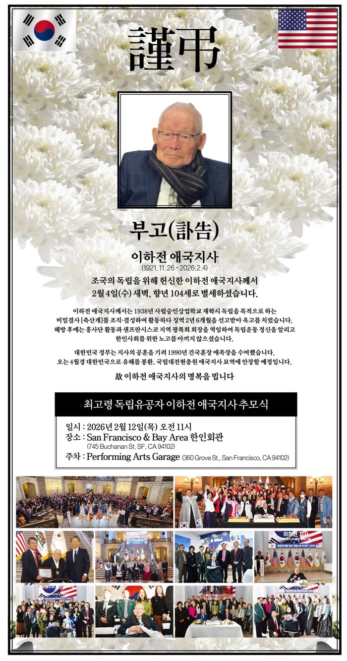 이하전 지사는 지난 2월 4일 향년 104세로 별세했다. 고인은 생전 최고령 독립유공자이자 해외에 거주하던 유일한 독립유공자로, 북가주 한인 사회의 살아 있는 역사이자 시대의 어른으로 존경을 받아왔다. San Francisco & Bay Area 한인회는 고인의 별세 소식에 깊은 슬픔을 표하며, 고인의 명복을 빌고 유가족에게도 진심 어린 위로의 마음을 전한다.