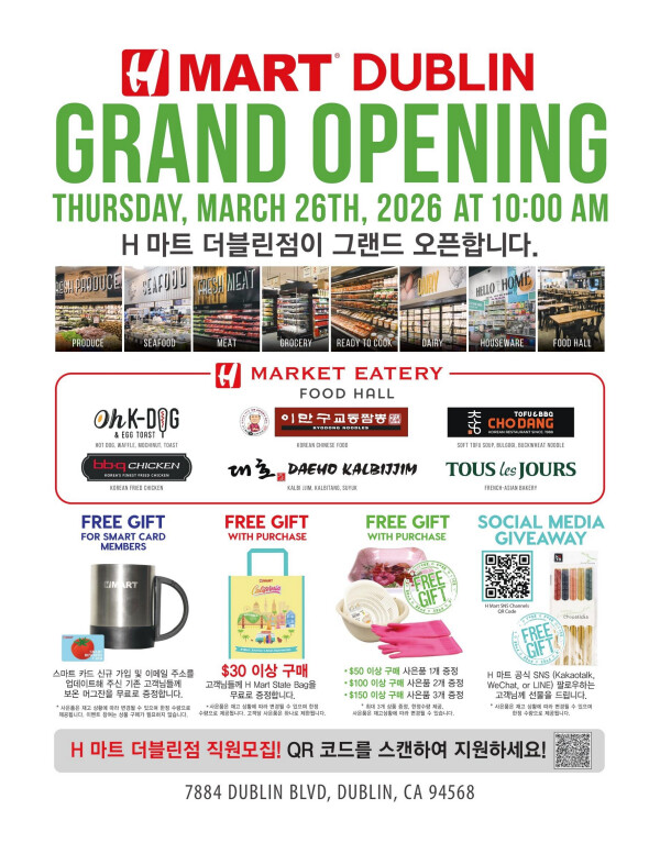 H마트가 북가주 더블린점을 오는 오는 26일 목요일 오전 10시에 공식 개점한다. H마트 더블린점(7884 Dublin Blvd​)은 매장의 면적은 약 3만 7천 252 스퀘어피트로 매장 운영시간은 매일 아침 8시부 터 밤 10시까지 연중무휴로 운영된다.